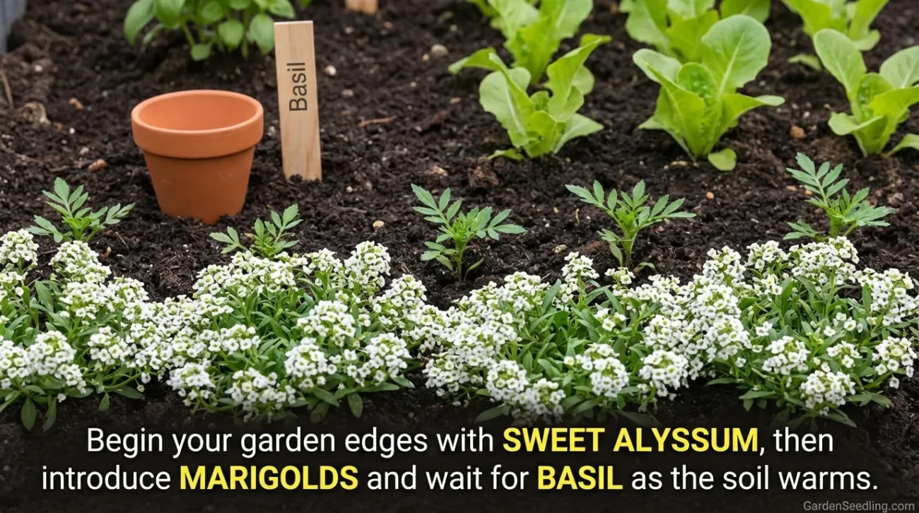 Start with sweet alyssum (or another long bloomer) on the edges. Add marigolds once the soil warms. In cooler areas, wait on basil until nights settle down.