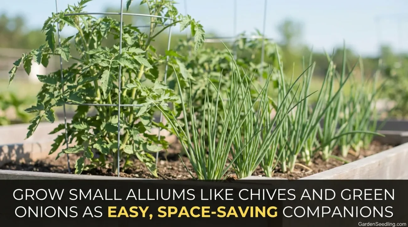 Alliums (chives, scallions, bunching onions) stay narrow and don’t steal light. They’re easy companions when you want something low-risk that still adds diversity.