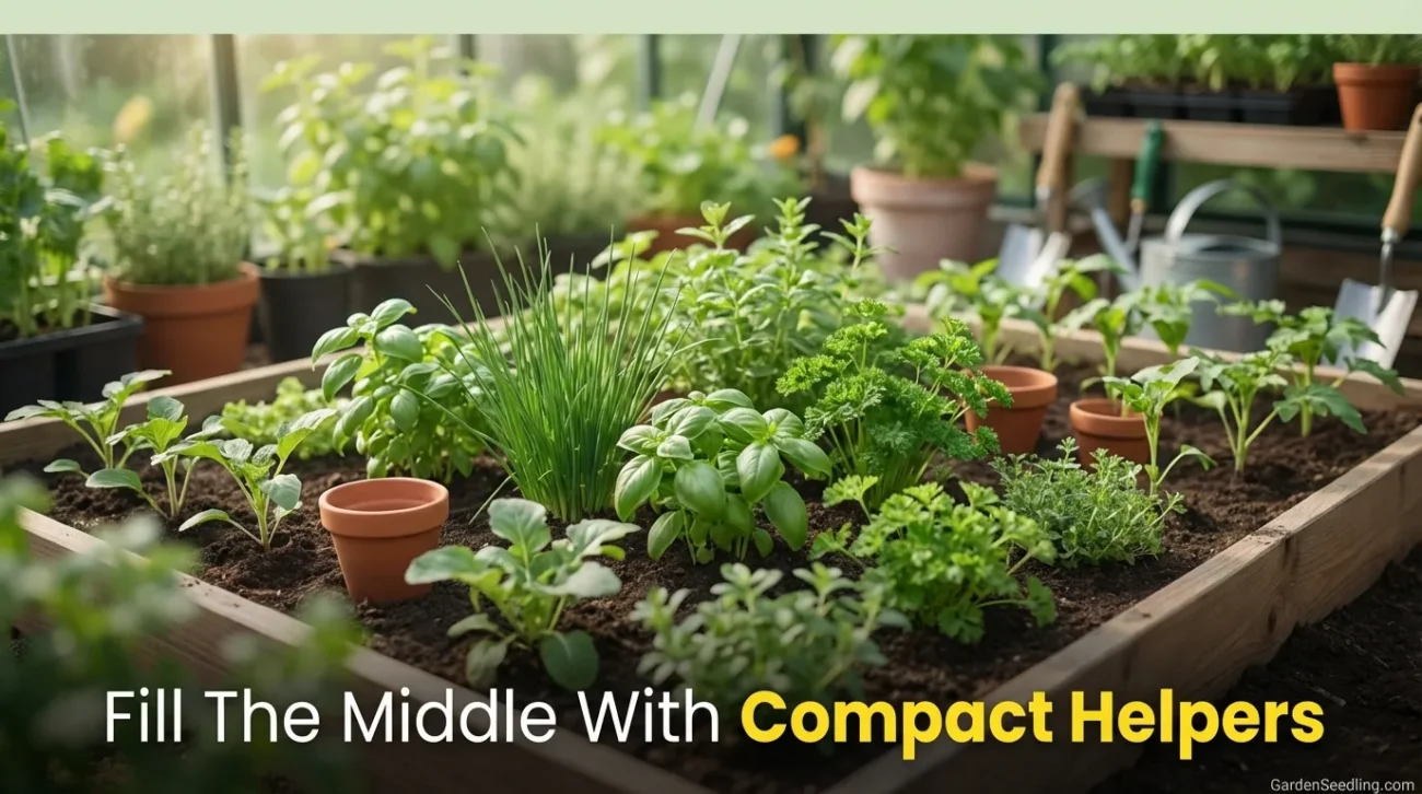 Basil between cages, chives near the front, parsley tucked where it won’t choke the stems—done. Keep the center of the bed open.