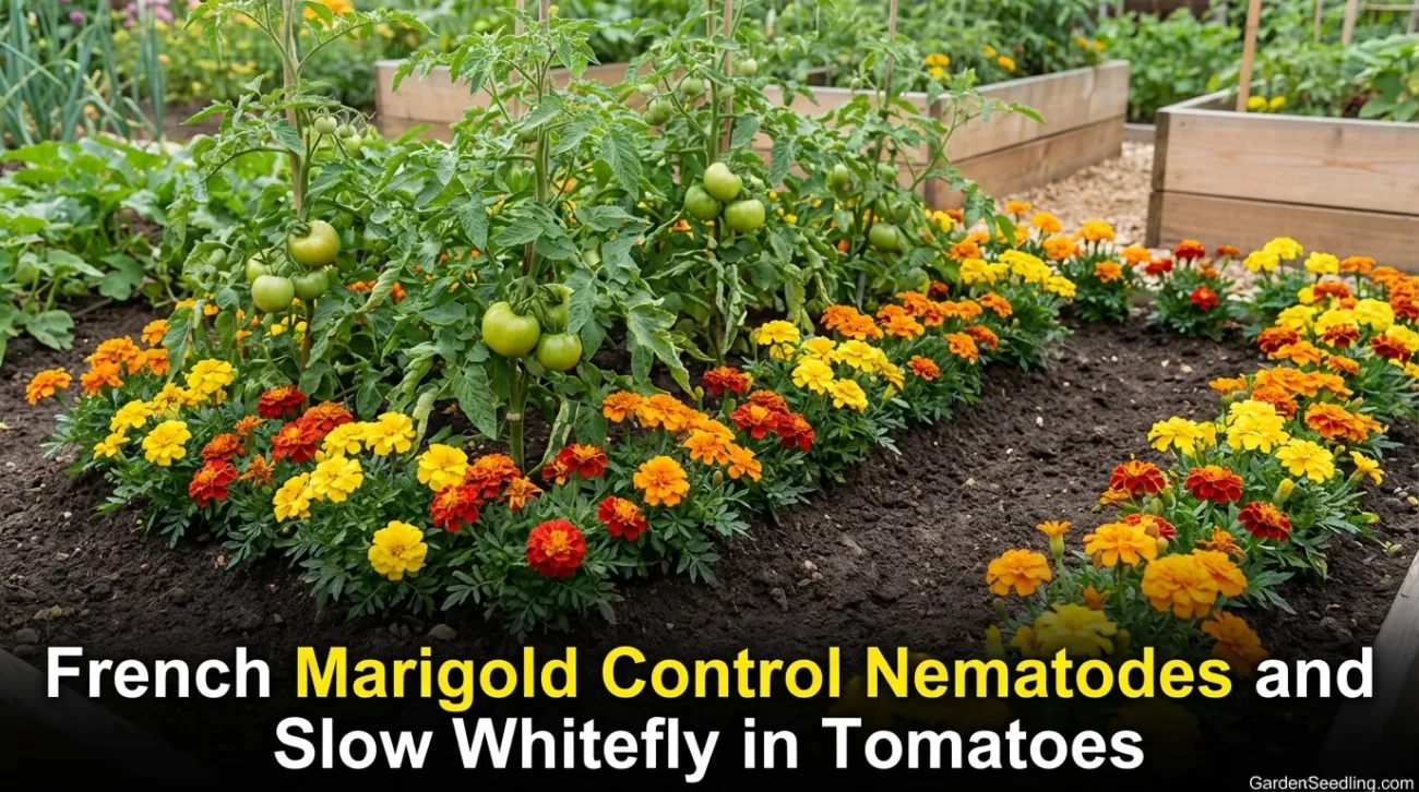 French marigolds have two big roles: they’re used in nematode management, and controlled trials in protected growing spaces show marigolds can slow whitefly population build-up when planted alongside tomatoes from the start. Timing matters. Late planting helps less.