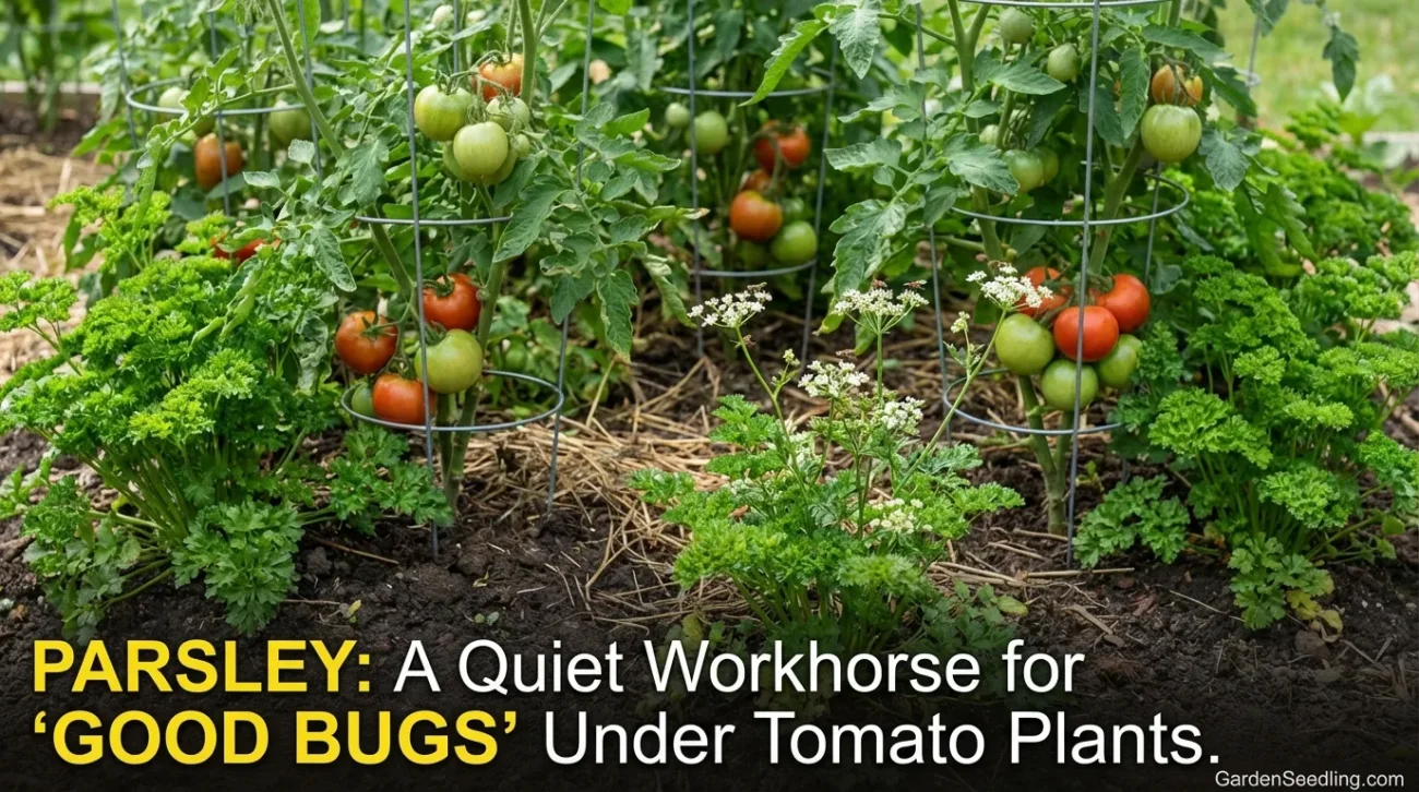 Parsley stays compact early, then flowers later if you let it. Those blooms can support beneficial insects. It’s also a nice living mulch under taller tomatoes—if you keep airflow in mind.