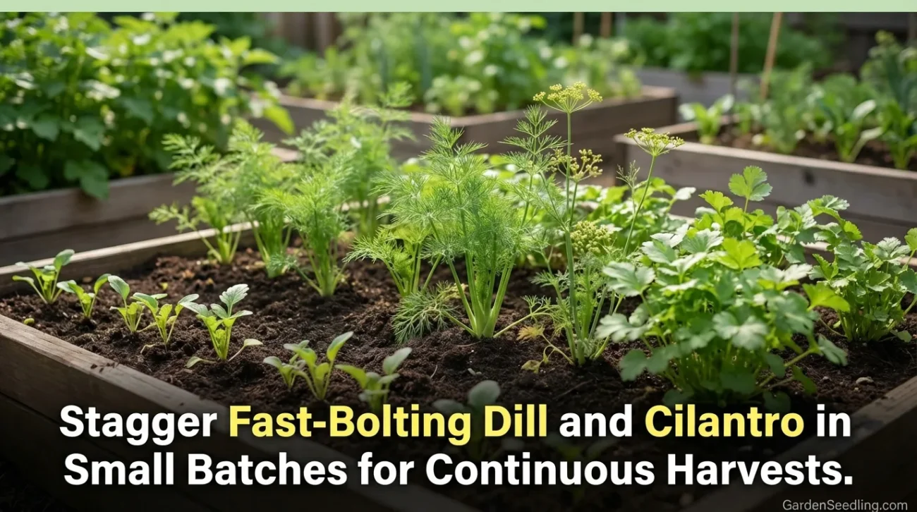 Dill and cilantro can bolt quickly. Plant small batches every couple of weeks, or you’ll get one big bloom moment and then… nothing.