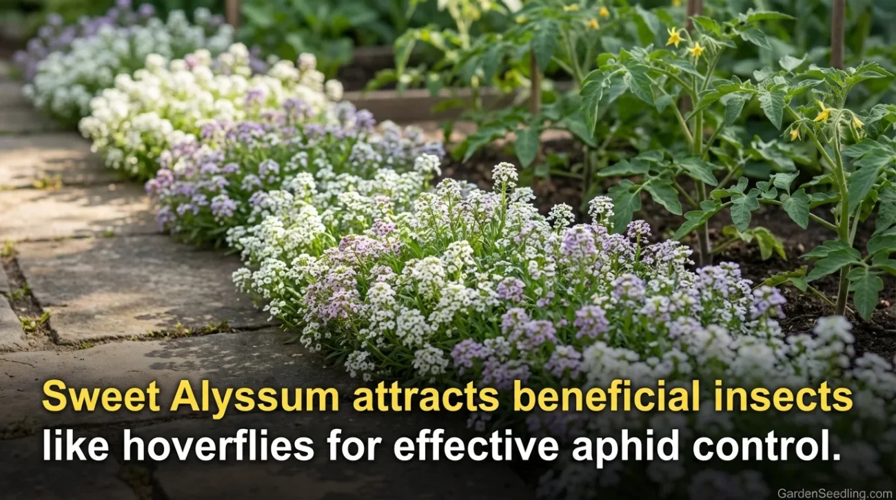 Sweet alyssum is a favorite in insectary plant research because it can bloom for a long stretch and attracts hoverflies—whose larvae eat aphids. It’s low, tidy, and easy to tuck into the edge of a tomato companion planting chart.