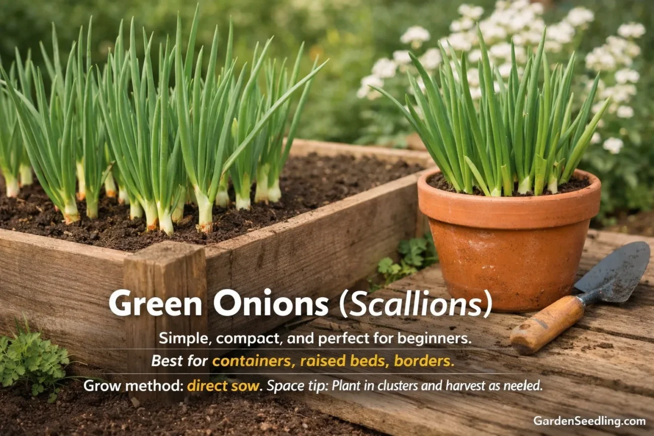 | Green Onions | Fast | Full sun to part shade | Very low | Direct sow | Perfect for edges and containers |