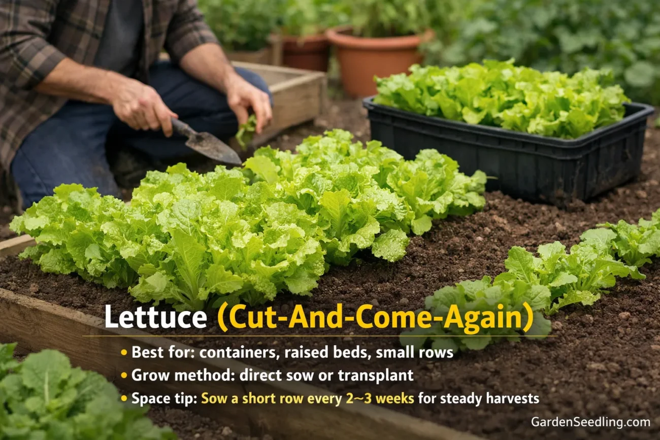 | Lettuce | Fast | Full sun to part shade | Low | Direct sow or transplant | Harvest outer leaves for repeat picks |
