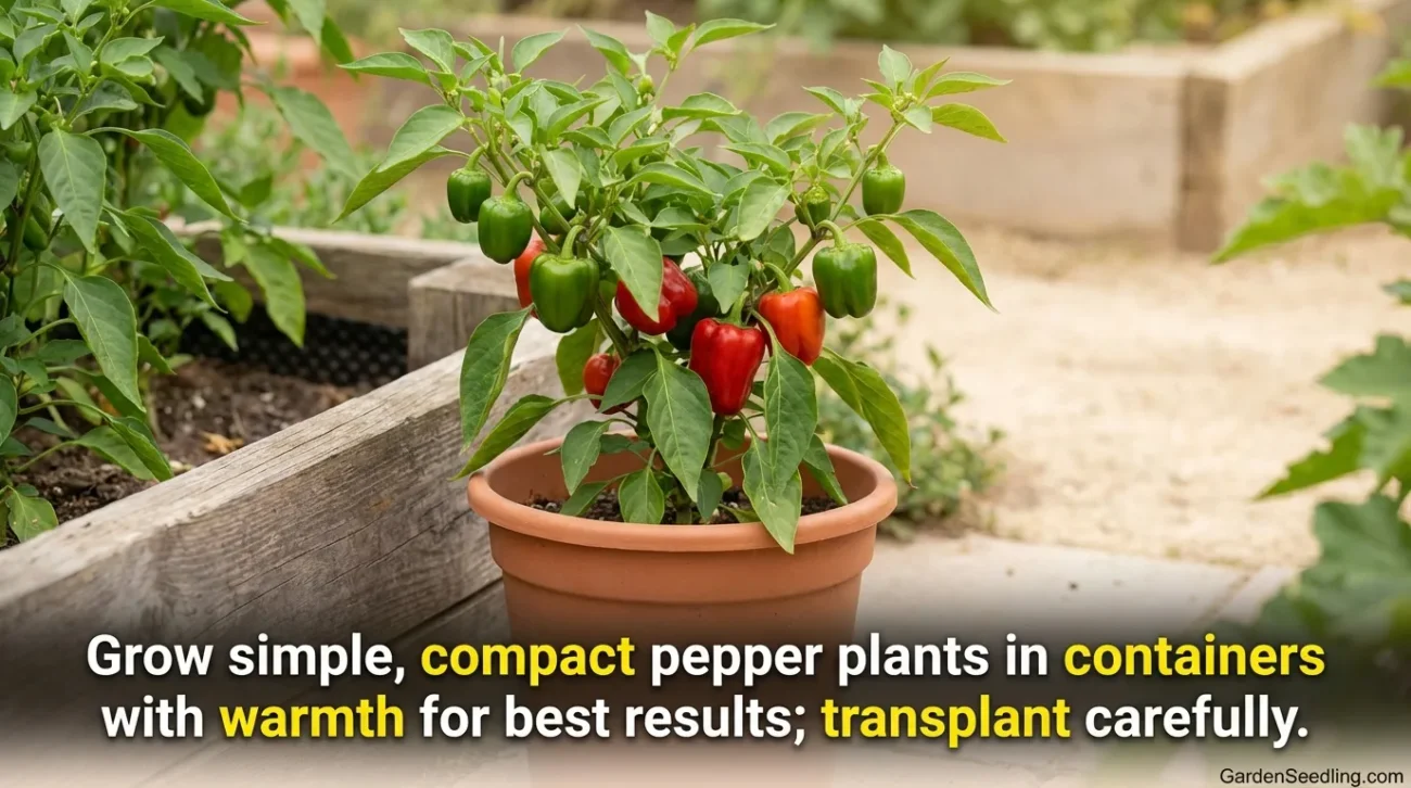 For best results, use at least a 5-gallon container for tomatoes and a 3–5+ gallon container for peppers, both with drainage holes.