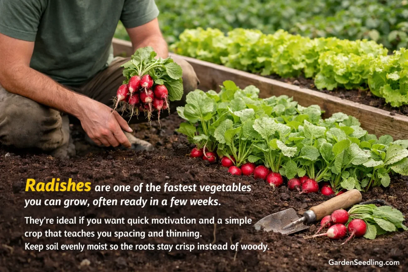 Loose-leaf lettuce and radishes are among the easiest because they sprout quickly and grow well in small beds or containers.