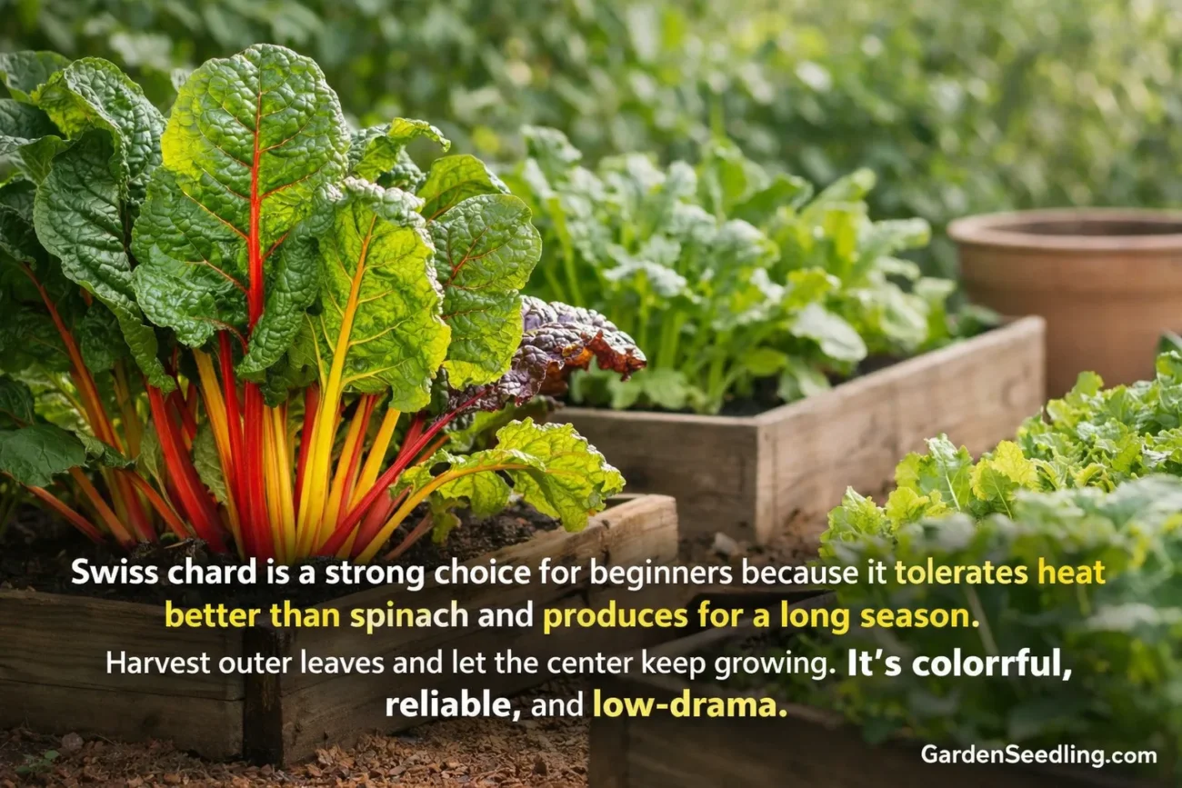 Swiss chard is a strong choice for beginners because it tolerates heat better than spinach and produces for a long season. Harvest outer leaves and let the center keep growing. It’s colorful, reliable, and low-drama.