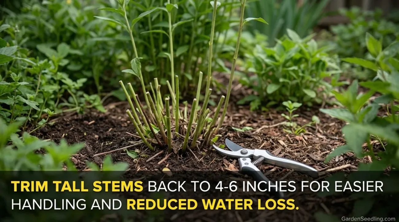 If the clump is tall or floppy, trim stems back to roughly 4 to 6 inches. You do not always have to do this, but it makes large plants easier to handle and slows water loss while the roots recover.