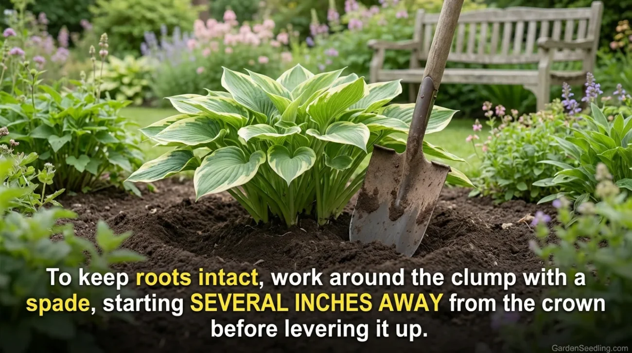 Start several inches away from the crown so you keep more roots intact. Work around the clump in a circle with a spade or fork, then lever it up. For really old hostas or ornamental grasses, this takes some effort. Sometimes a lot.