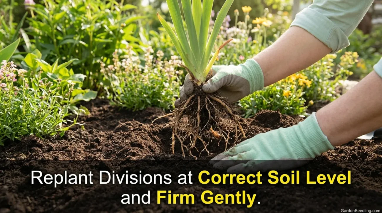 Set each division into its new hole at the same soil level it had before. Spread roots outward instead of stuffing them into a narrow hole. Firm the soil gently around the crown so there are no large air pockets.