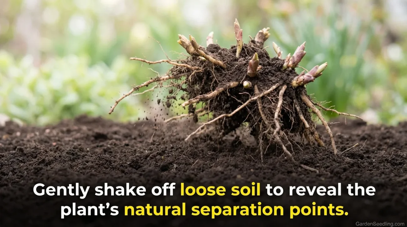 Brush or shake away enough soil to see where the crown separates naturally. You are looking for buds, shoots, fans, or sections with their own root mass. Old woody centers can often be discarded.
