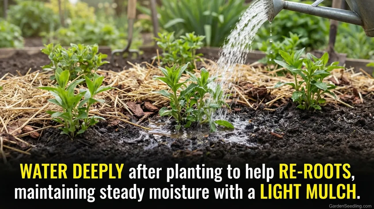 Water right after planting. Then keep the soil evenly moist while the plant re-roots. Not soggy. Just steady. A light mulch helps hold moisture and keeps weeds from taking advantage of disturbed soil.