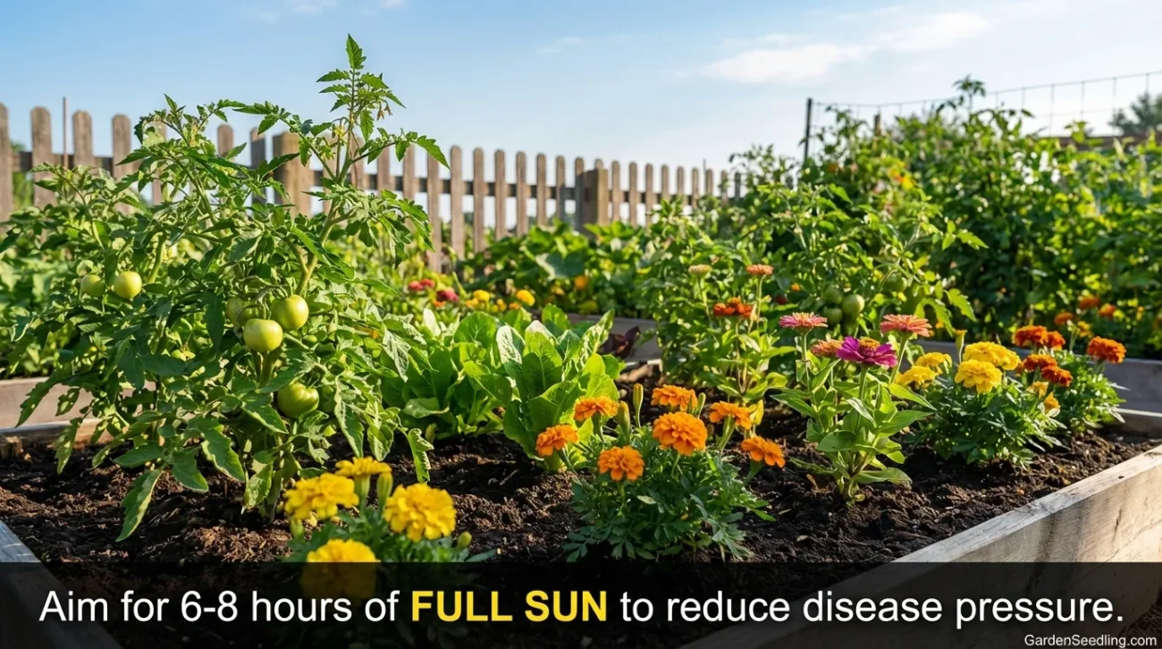 Most beginner problems come from the location, not the plant. For vegetables and many flowers, aim for full sun—about 6 to 8 hours of direct light. Morning sun is especially helpful because it dries leaves faster and can reduce disease pressure.