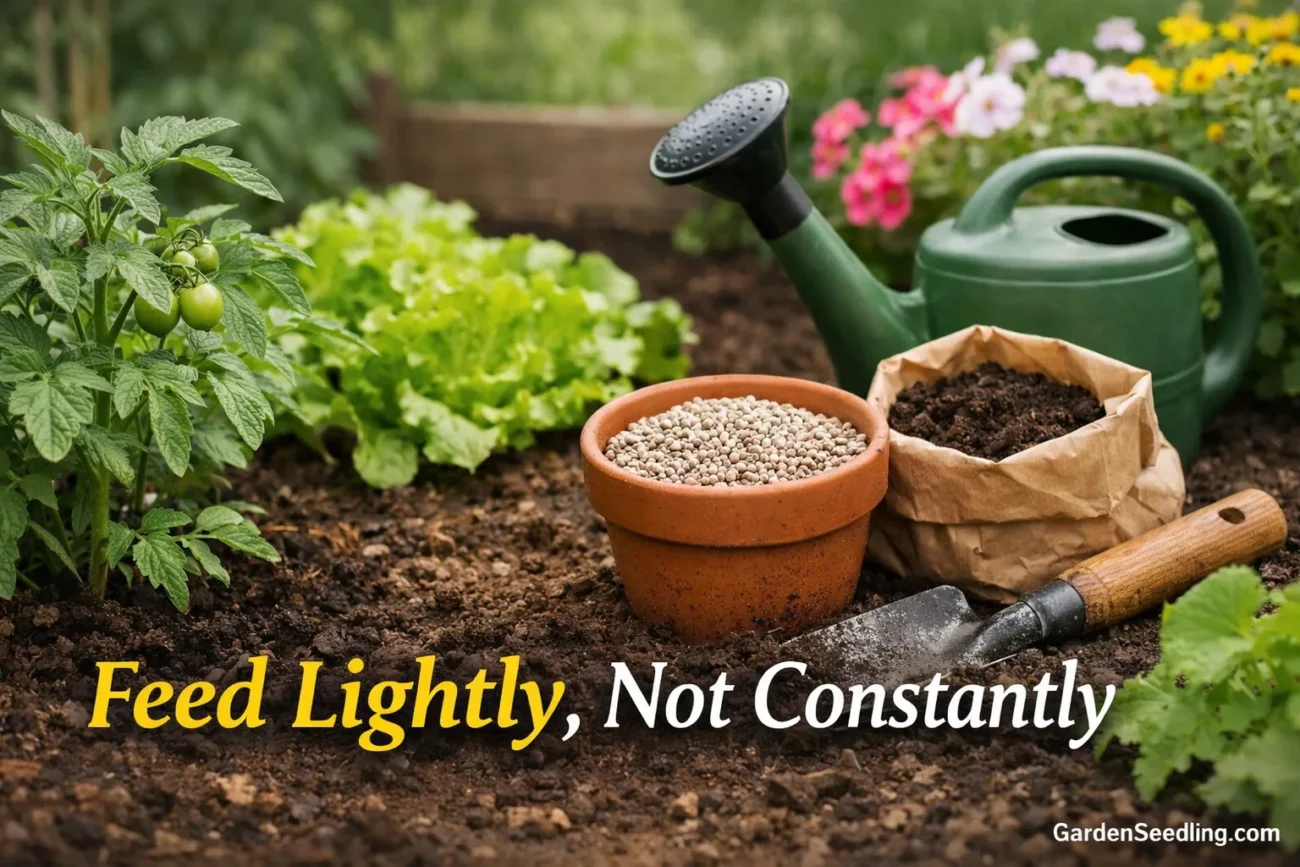 If your soil has compost, many plants won’t need much extra feeding early on. Over-fertilizing can cause fast leafy growth with fewer flowers and fruits. If plants look pale or growth is slow, use a gentle fertilizer and follow the label.