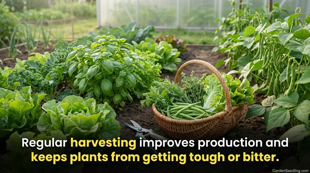 Harvesting is part of plant care. Picking beans, herbs, and greens regularly can improve production and keep plants from getting tough or bitter.