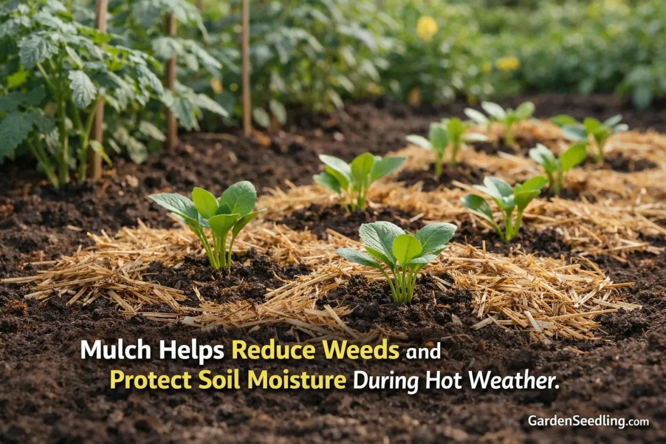 Mulch is one of the easiest ways to reduce weeds and protect soil moisture. After seedlings are a few inches tall, add a 1–2 inch layer of mulch, keeping it slightly away from stems. Mulch helps prevent stress during hot weather.