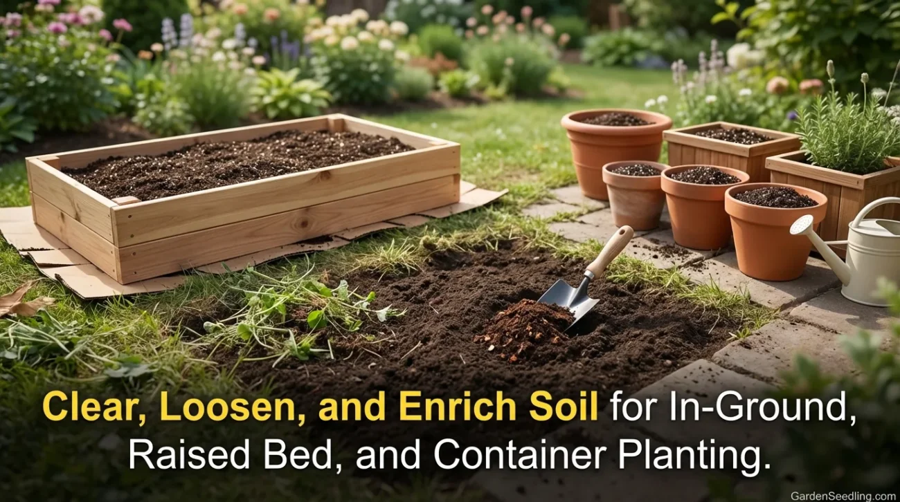 - In-ground: remove grass/weeds, loosen soil, add compost.