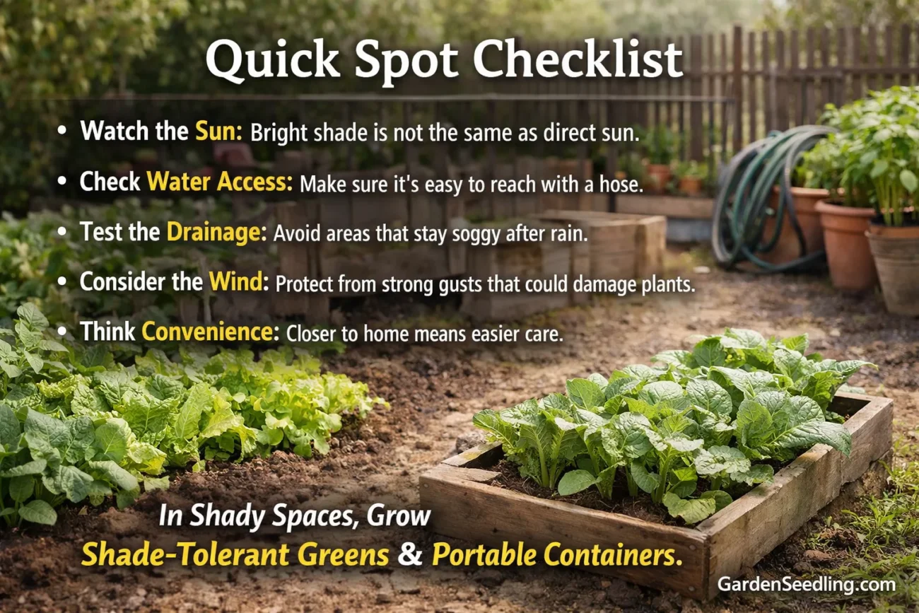 If your only space is shady, don’t force sun-loving crops. Lean into shade-tolerant greens (lettuce, arugula, spinach) and containers that you can move into better light.