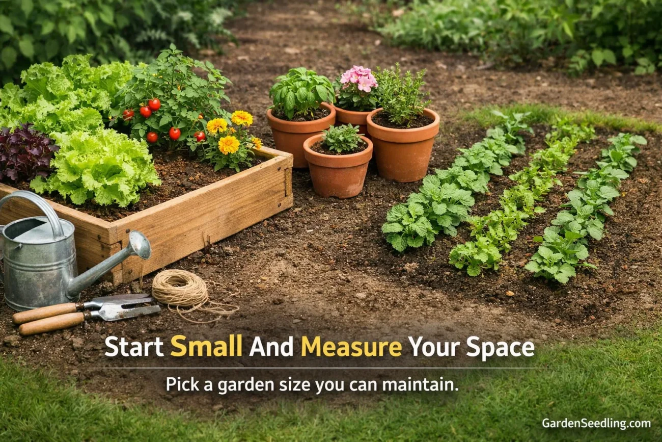 Pick a garden size you can maintain. A 4×4 raised bed, 4–6 medium pots, or a 3-foot-wide in-ground strip is enough to learn a lot without getting overwhelmed. Keeping it compact makes watering and weeding realistic.