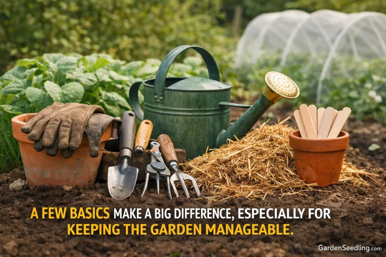 You don’t need a shed full of gear to begin. A few basics make a big difference, especially for keeping the garden manageable.